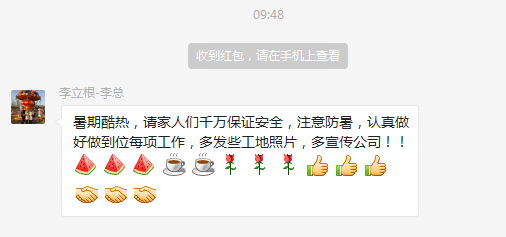 炎熱酷暑老板關(guān)心慰問(wèn)員工家人們,發(fā)個(gè)紅包提高大家的熱情!